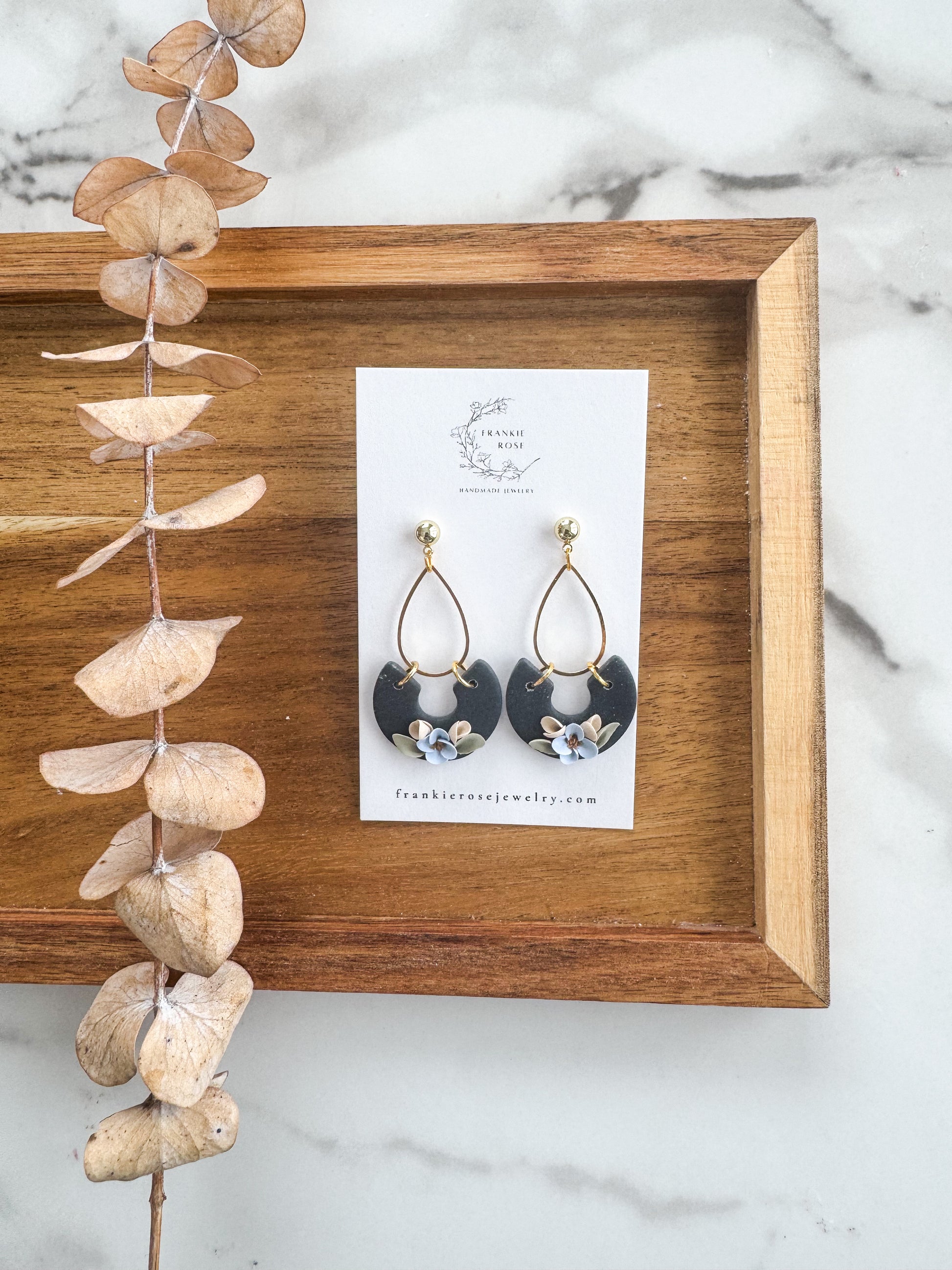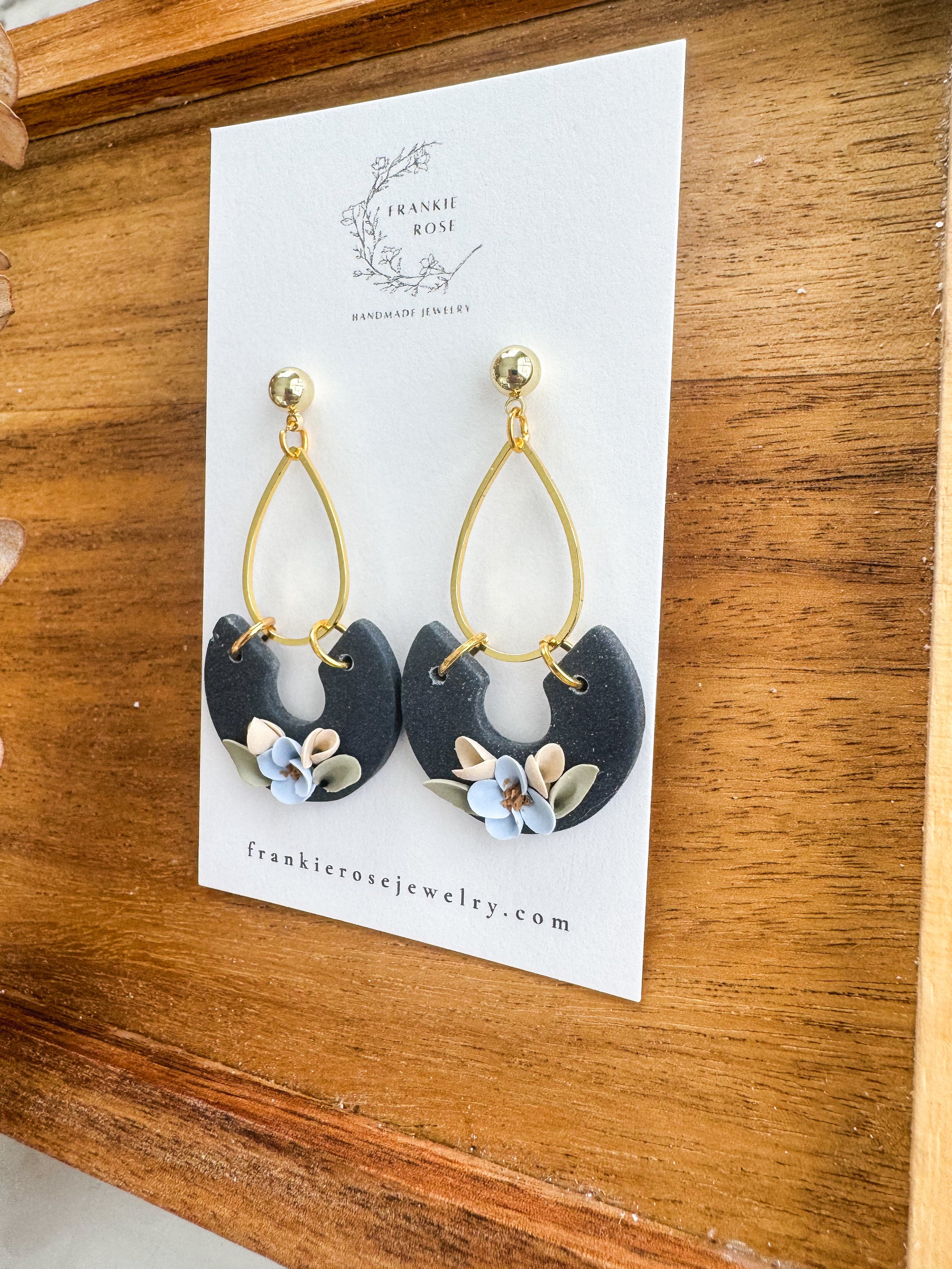These handcrafted earrings feature a bold clay silhouette accented with delicate, hand-sculpted floral details. Soft, muted blooms rest against a rich clay base, creating a beautiful contrast of texture and color. Finished with a warm brass teardrop frame and stud backing, these earrings balance organic artistry with refined design. Lightweight despite their statement size, each pair is thoughtfully made by hand, ensuring subtle variations that make every set truly one of a kind.