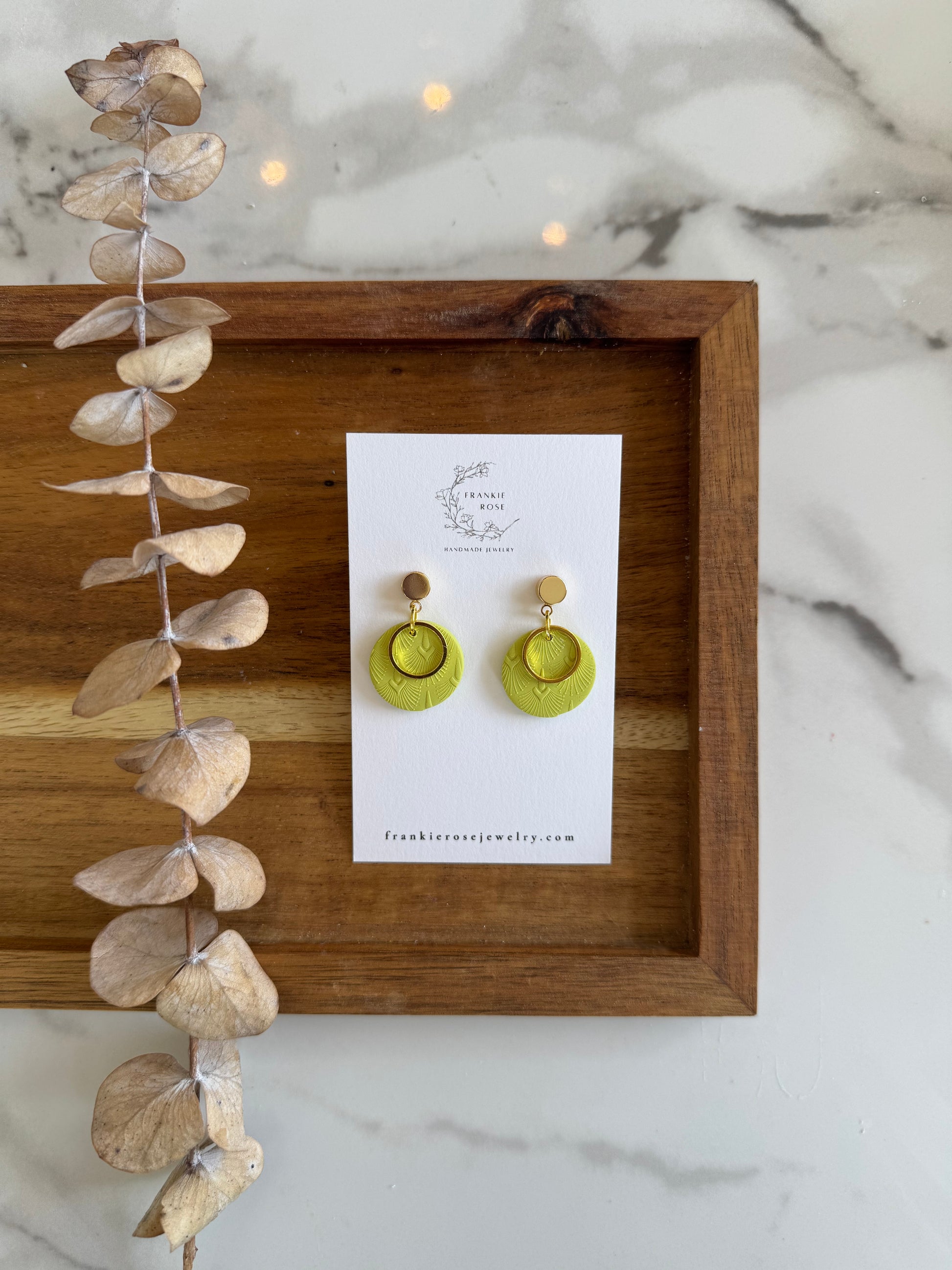 Expertly crafted Citron texture clay circles featuring intricate pattern designs paired with elegant brass circle charms. These lightweight earrings have brass round studs, offering sophisticated style without the weight.