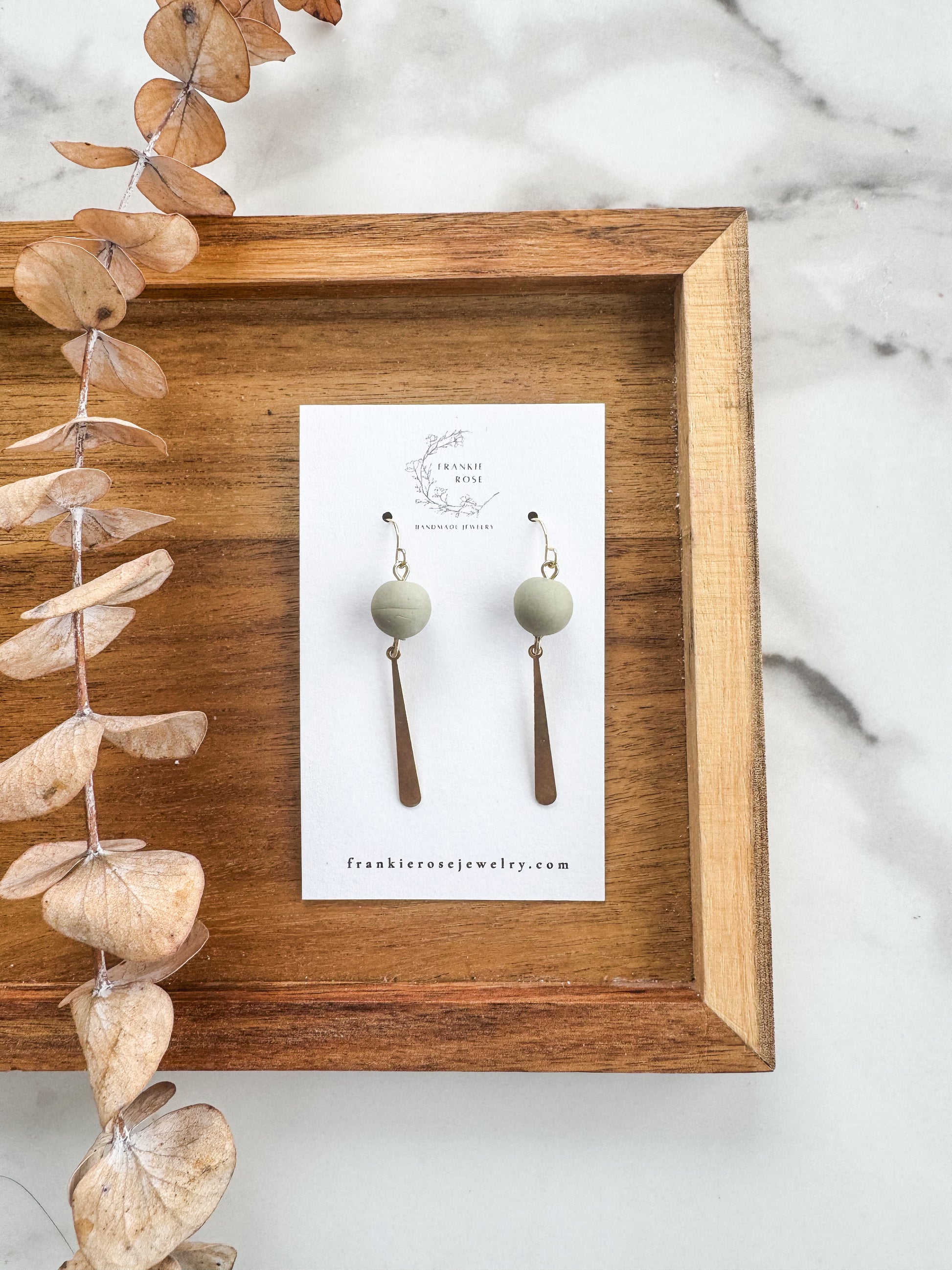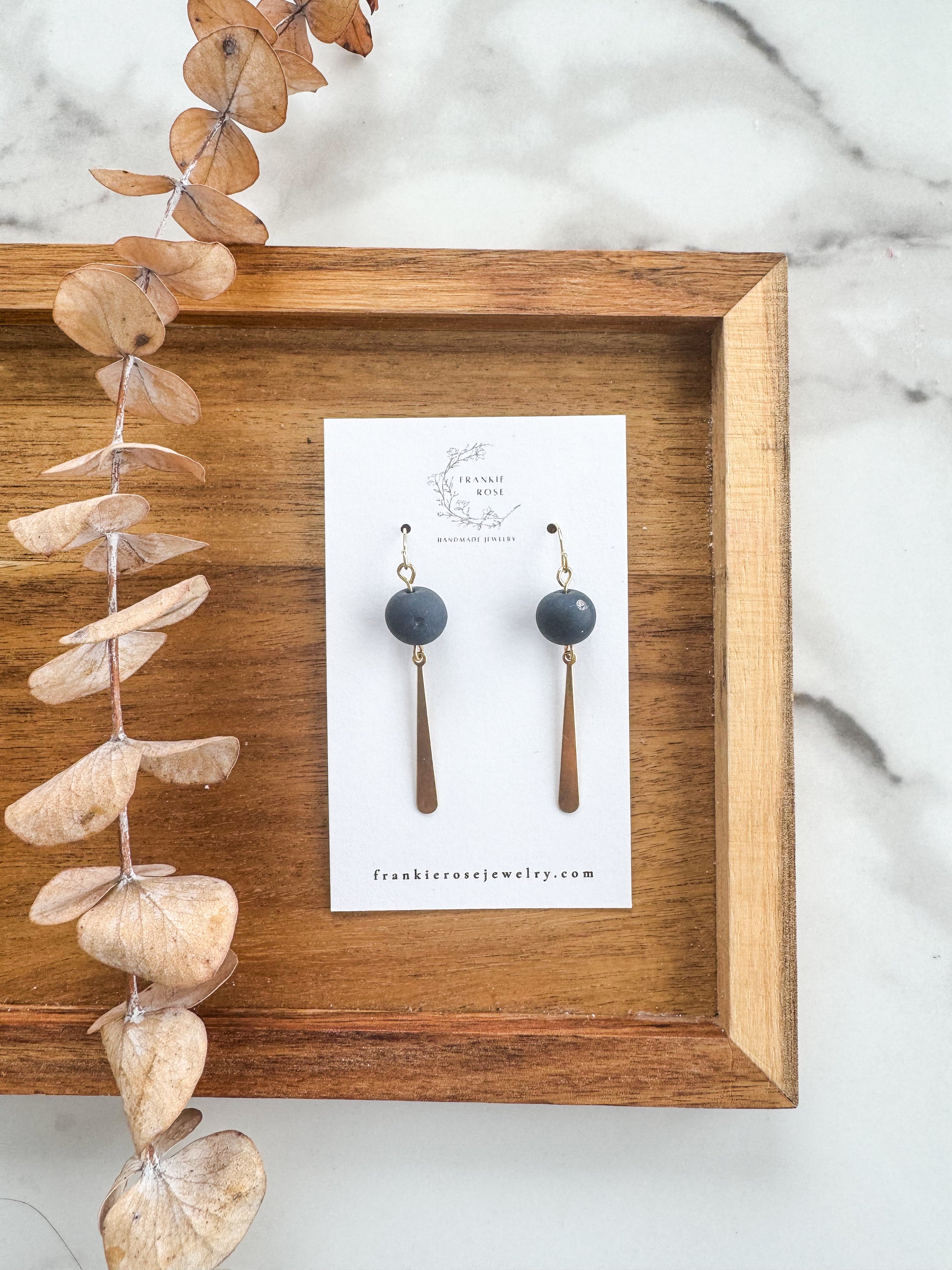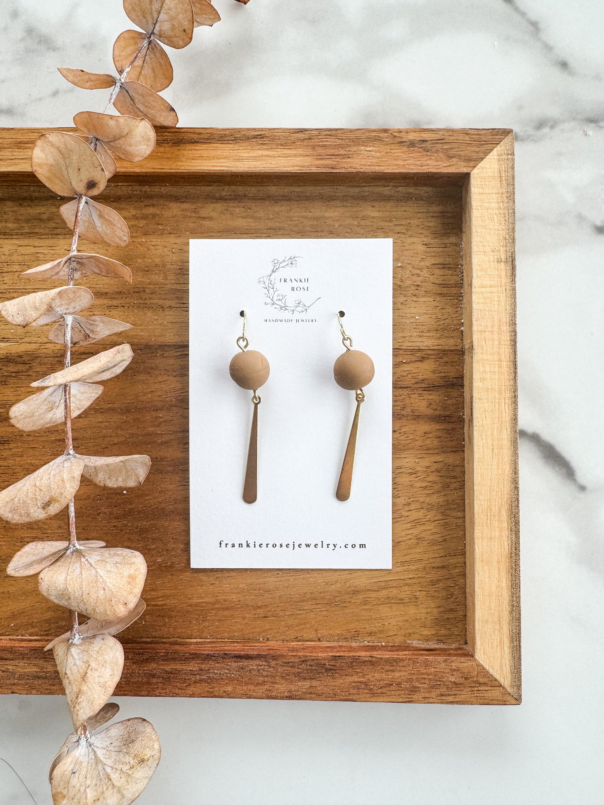 These handcrafted earrings feature soft, matte clay beads paired with a sleek brass dangle charm for a perfectly balanced look. Lightweight and comfortable for all-day wear, they bring an effortless mix of modern simplicity and warm, organic texture. Each pair is carefully assembled by hand, making every set uniquely yours. The neutral color palette and minimalist silhouette make them easy to dress up or down—perfect for everyday wear or a subtle statement. Choose from 4 different colors.