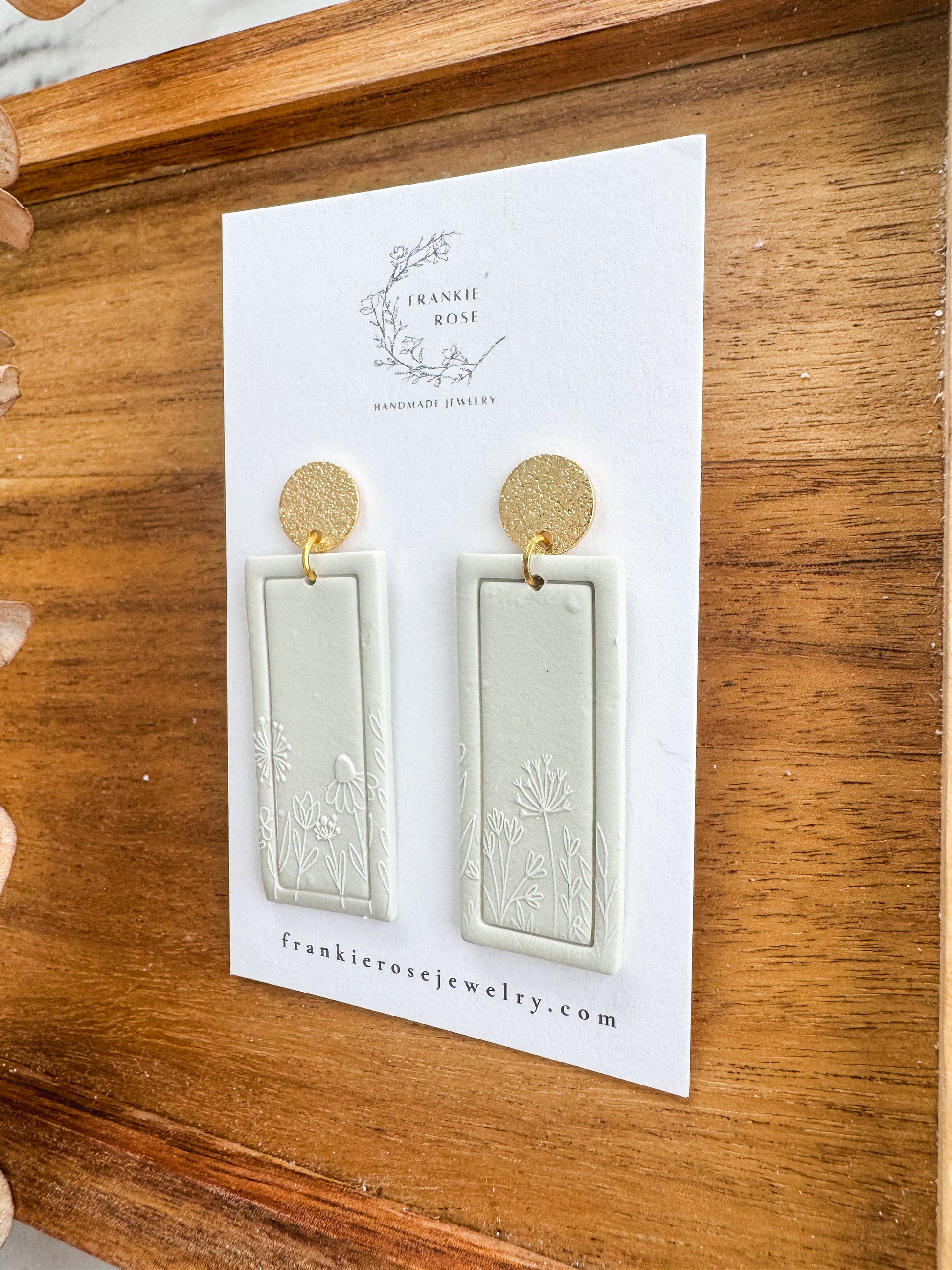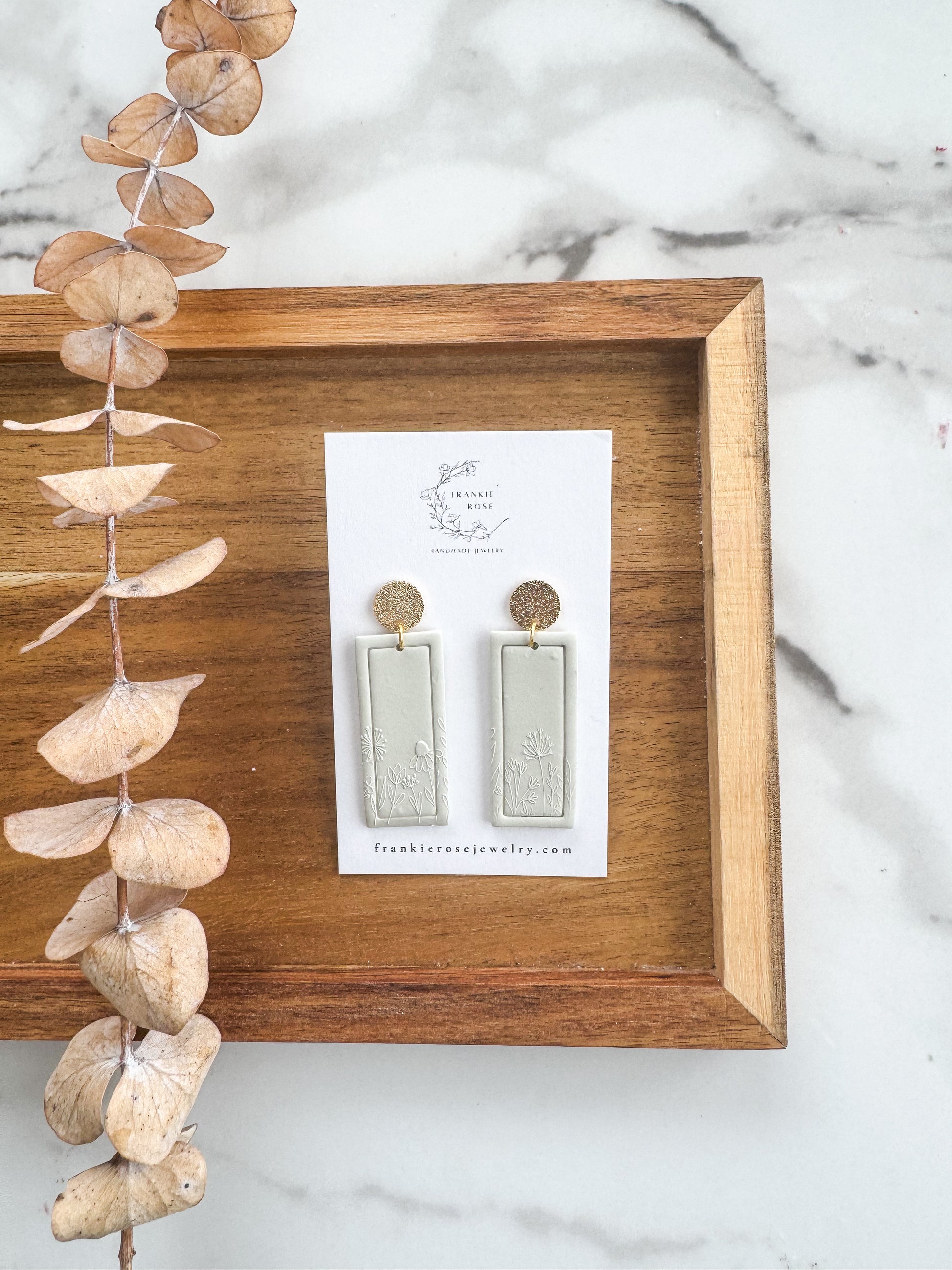 These handcrafted earrings feature soft, rectangular clay drops embossed with delicate floral details, creating a subtle, nature-inspired texture. Paired with a warm, textured brass stud, the design blends organic beauty with modern simplicity. Lightweight and comfortable, these earrings are thoughtfully made for everyday wear while still offering a refined statement. Each pair made by hand, making every set beautifully unique.