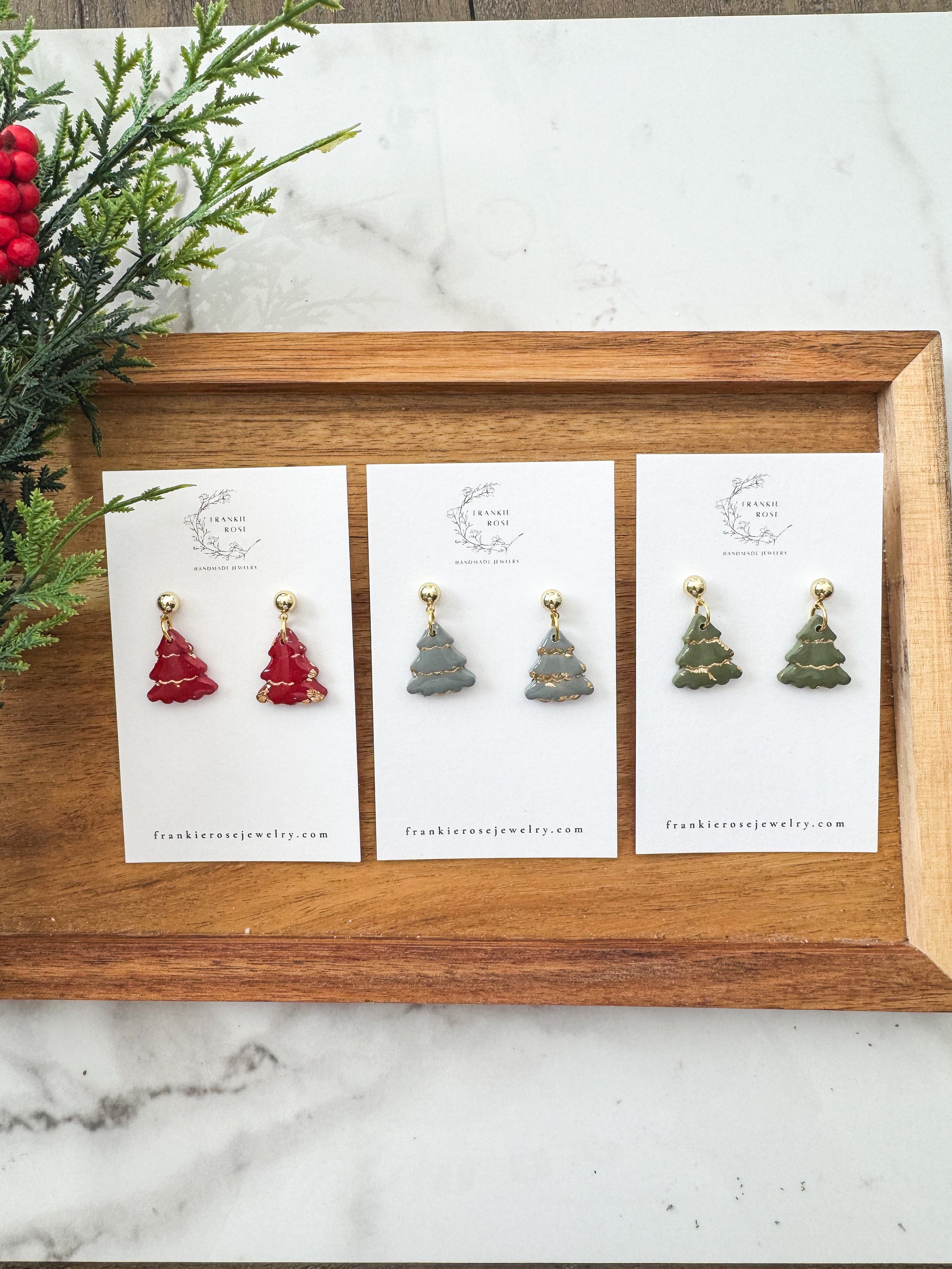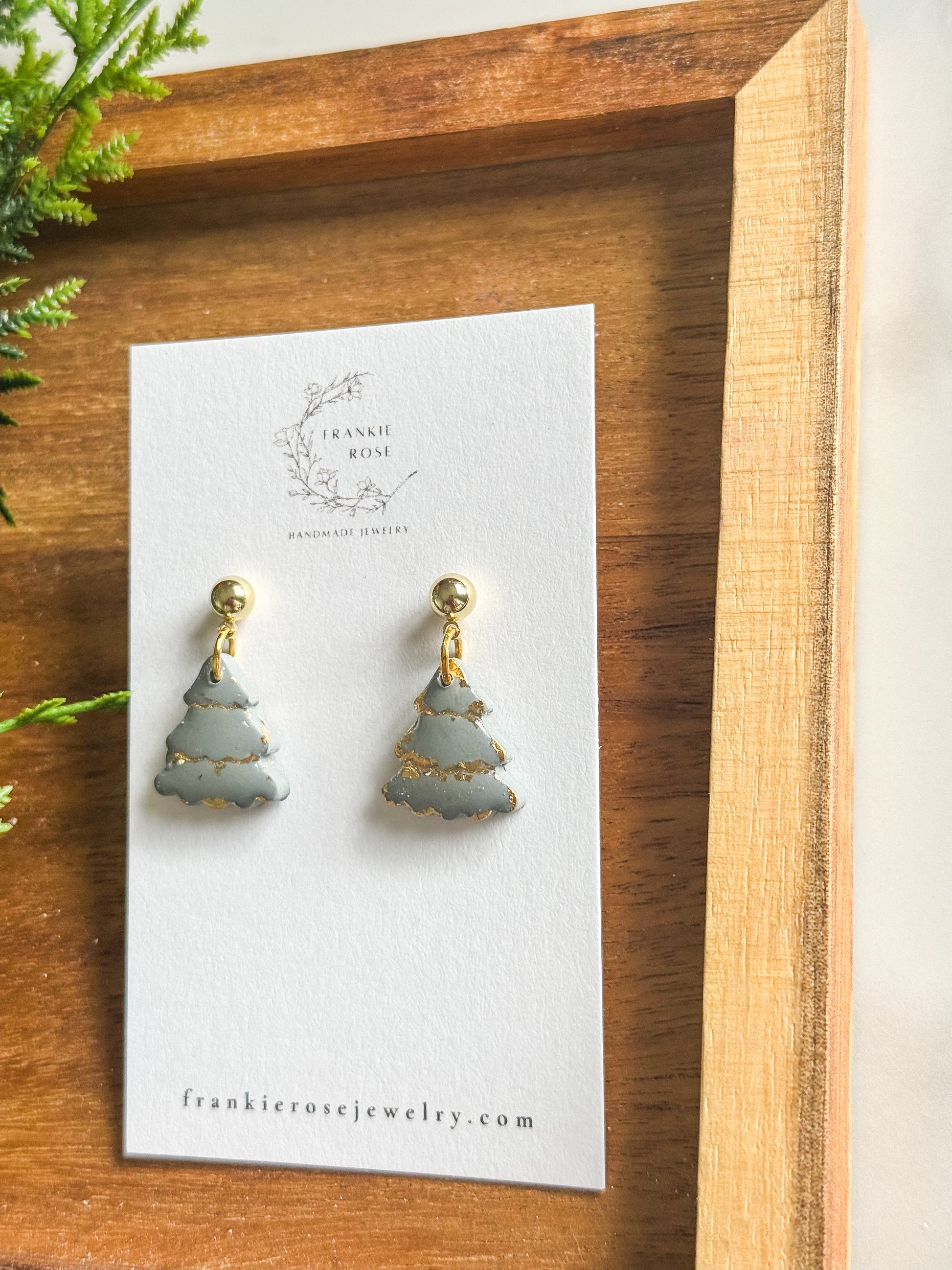These handcrafted gold flake Christmas trees are made from durable polymer clay, each uniquely embedded with shimmering gold flakes under a smooth resin finish. Every pair is one-of-a-kind, showcasing individual variations in flake placement. Choose your preferred combination from grey, red, or green bases accented with either gold or silver flakes for a festive and elegant touch to your holiday decor or jewelry collection.